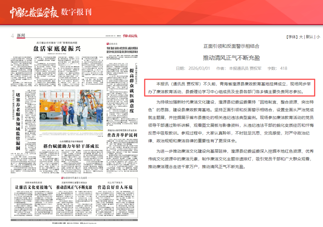 3月1日,《中国纪检监察报》“加强新时代廉洁文化建设”栏目,对三月雨协助建设的“青海省湟源县廉政教育基地”挂牌成立进行了相关报道。2026-04-01