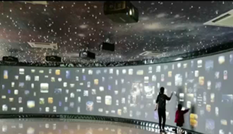 大型互动互动展项,通过投影融合技术、纳米多点触摸技术,实现弧形墙面支持多点互动。利用计算机的大数据计算能力实现大量照片或者视频可自由操作,如拖拽、放大、缩小等。