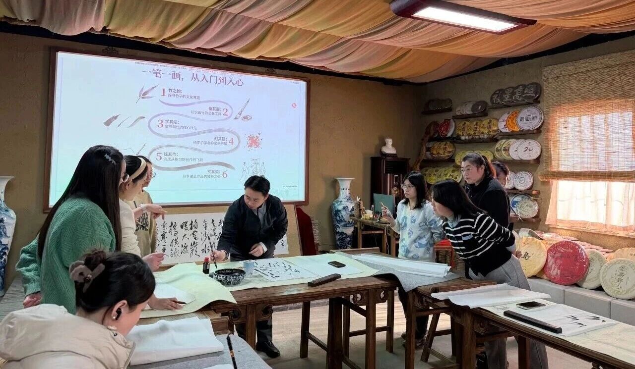 现场墨香四溢,学员们热情投入,亲身体验水墨创作的雅趣。指导老师耐心细致,从笔法运用、构图布局等方面逐一示范与纠正,并结合每位学员的特点给予个性化建议,营造出浓厚而温馨的学习氛围。