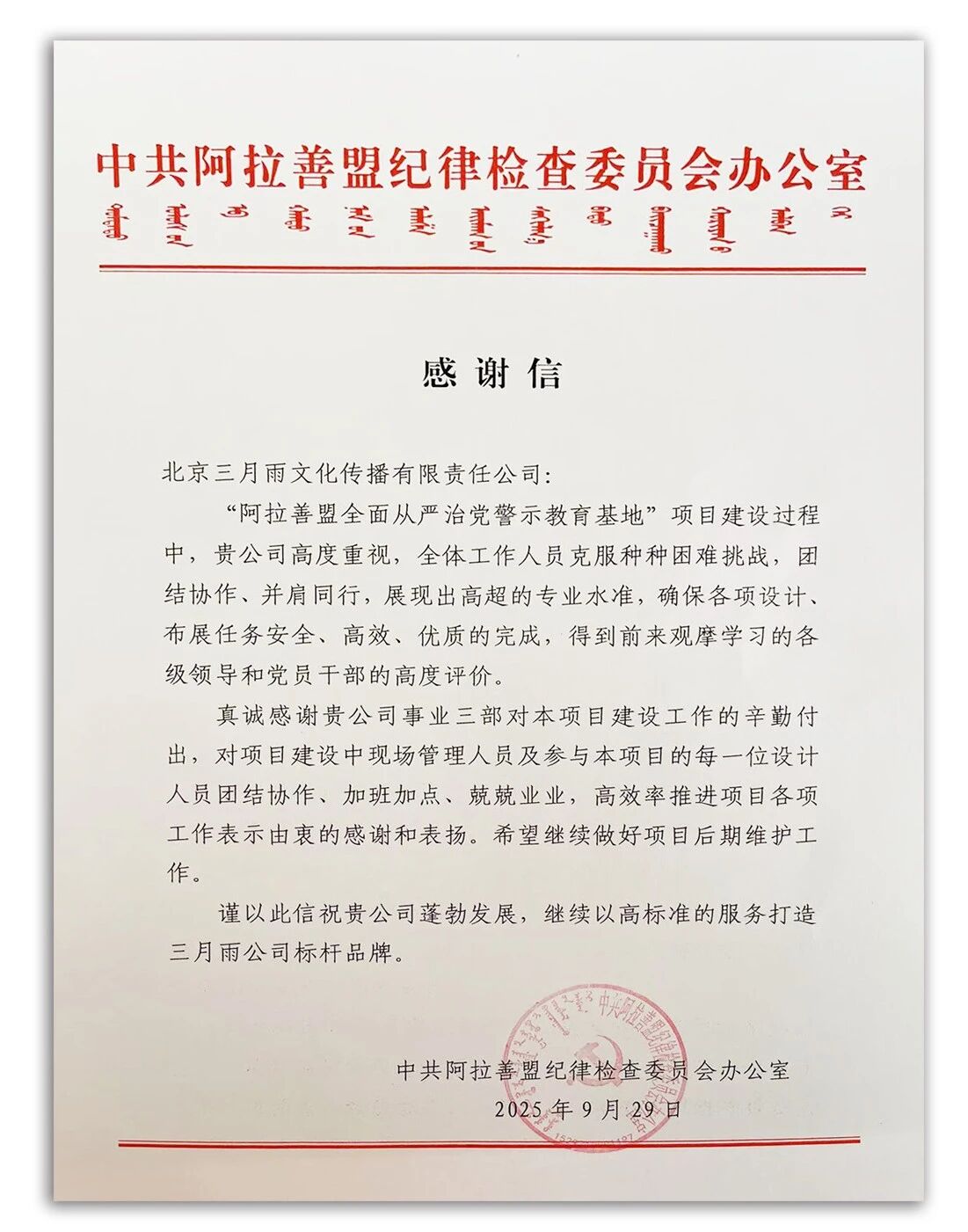 近日,三月雨收到一封来自中共阿拉善盟纪律检查委员会办公室的感谢信。信中对三月雨项目团队在承建“阿拉善盟全面从严治党警示教育基地”项目过程中,所展现的敬业精神和高超专业水准,予以充分肯定和表扬。