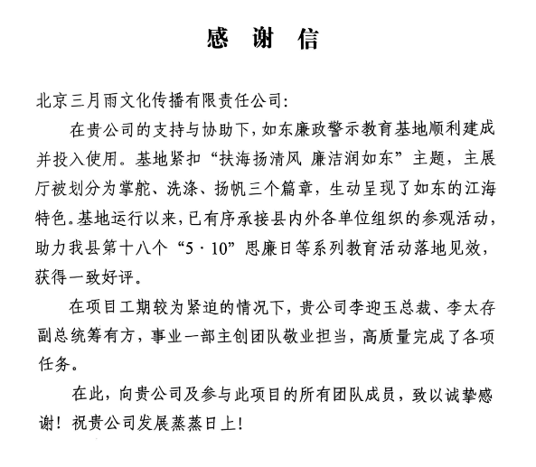 近日,三月雨收到来自中共如东县纪律检查委员会的感谢信。信中对三月雨项目团队在“如东廉政警示教育基地” 承建过程中展现的敬业精神与责任担当,给予高度肯定与诚挚感谢。