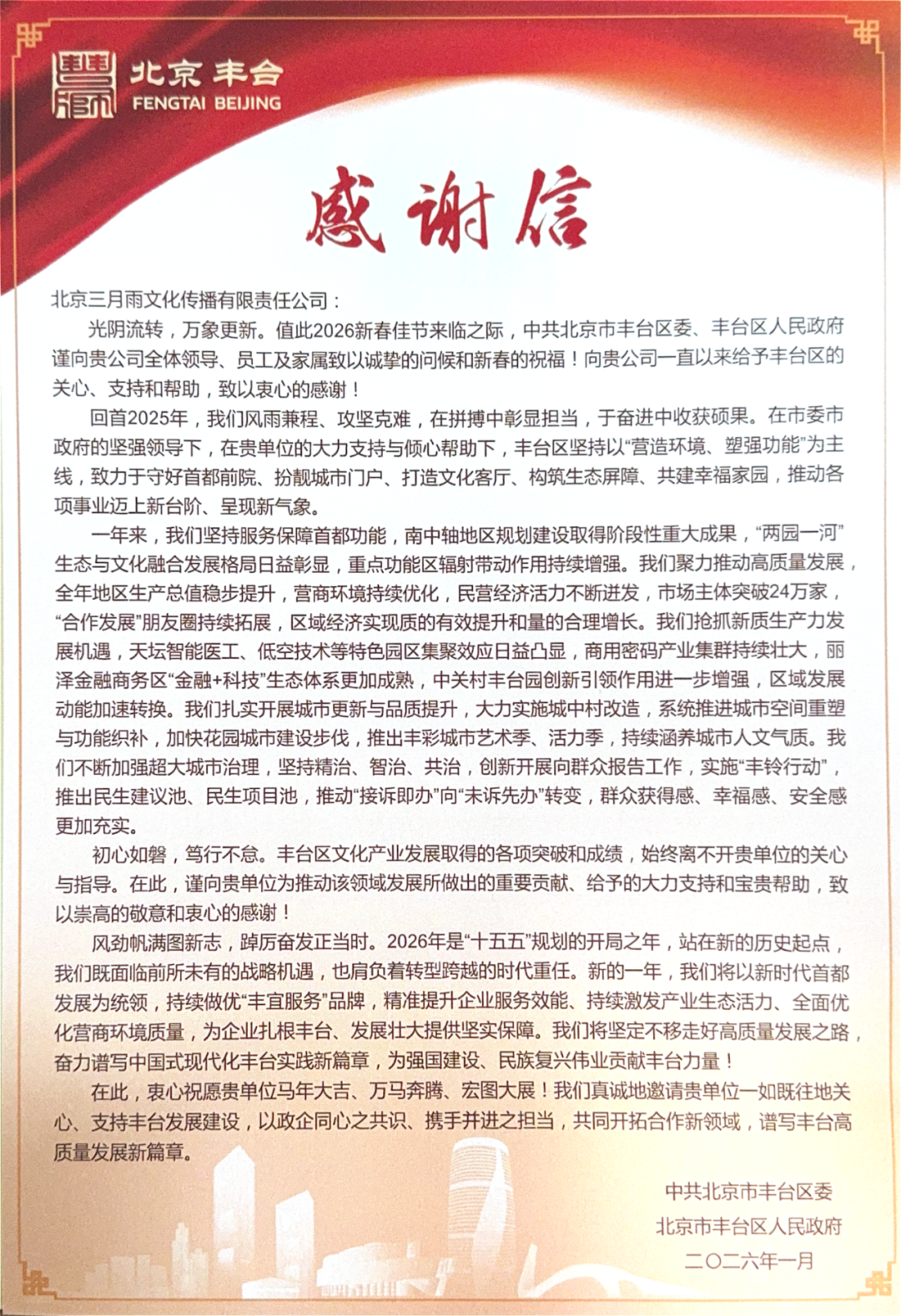 近日,三月雨收到一封来自中共北京市丰台区委、北京市丰台区人民政府的感谢信。信中对三月雨在过去一年为丰台区文化产业发展所作出的贡献表示充分肯定,并向公司全体员工致以新春问候。这封感谢信不仅是一份荣誉,更是一份鼓舞与期待,体现了丰台区委区政府对企业发展的高度重视与持续支持。