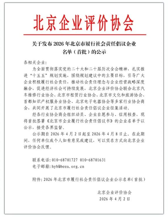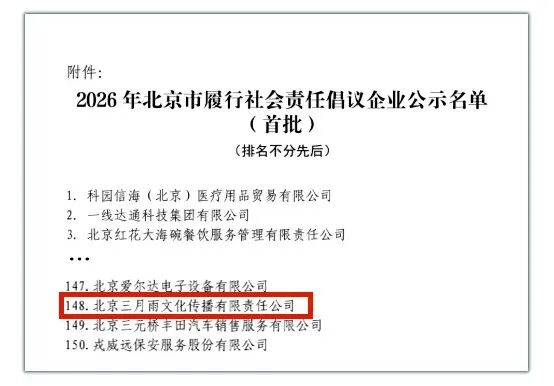 入选|三月雨获评“2026年北京市履行社会责任倡议企业”